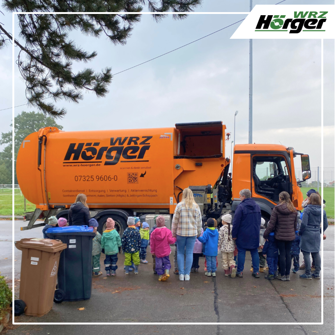 Mit großen Augen und gespannter Neugier empfingen die Kinder des Naturkindergartens Sontheim vor Kurzem einen ganz besonderen Besuch: Das orangefarbene Müllfahrzeug der Firma Hörger rollte direkt vor das Gelände des Kindergartens – ein Highlight nach mehreren Wochen intensiver Beschäftigung mit dem Thema "Müll und Umwelt".